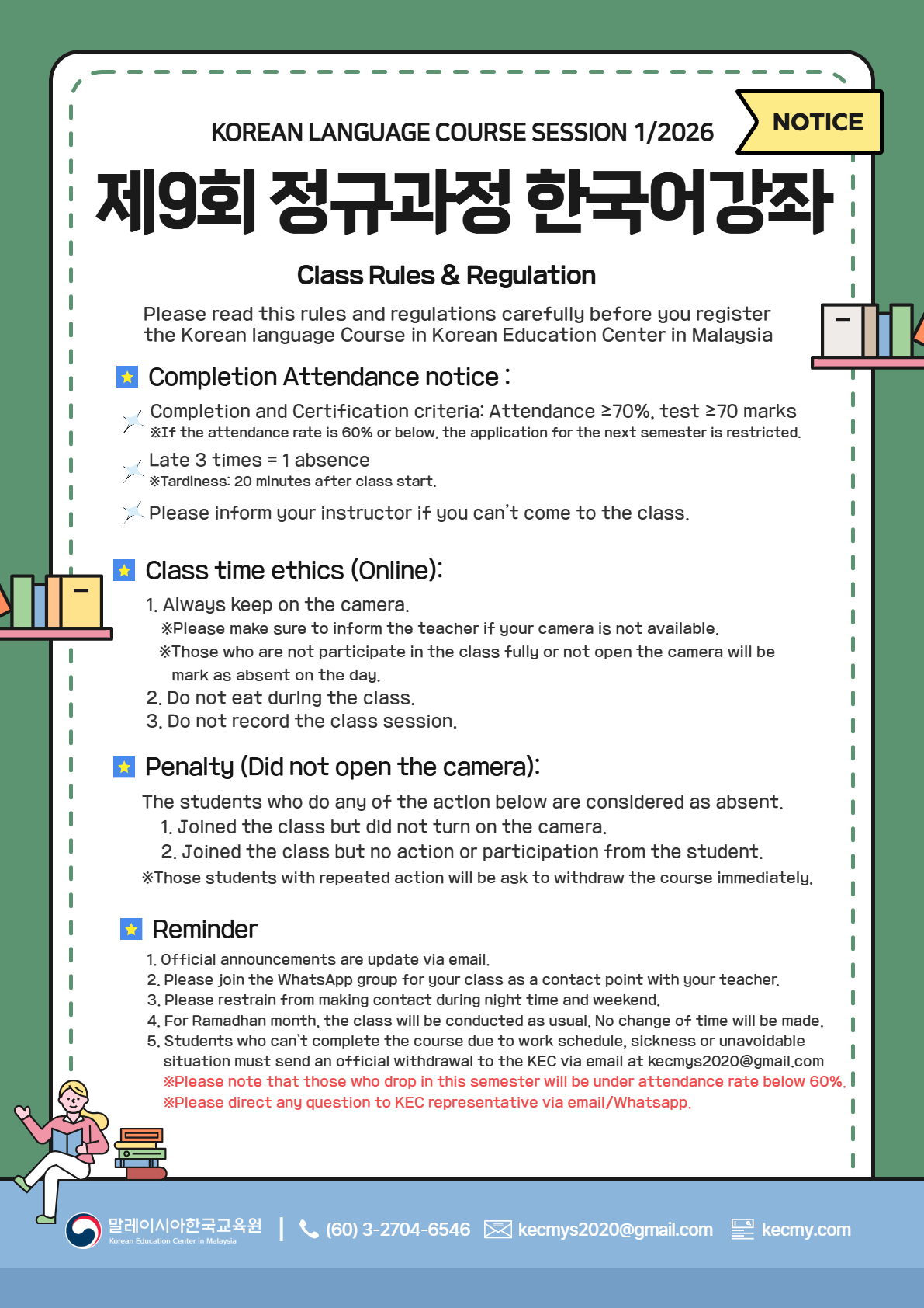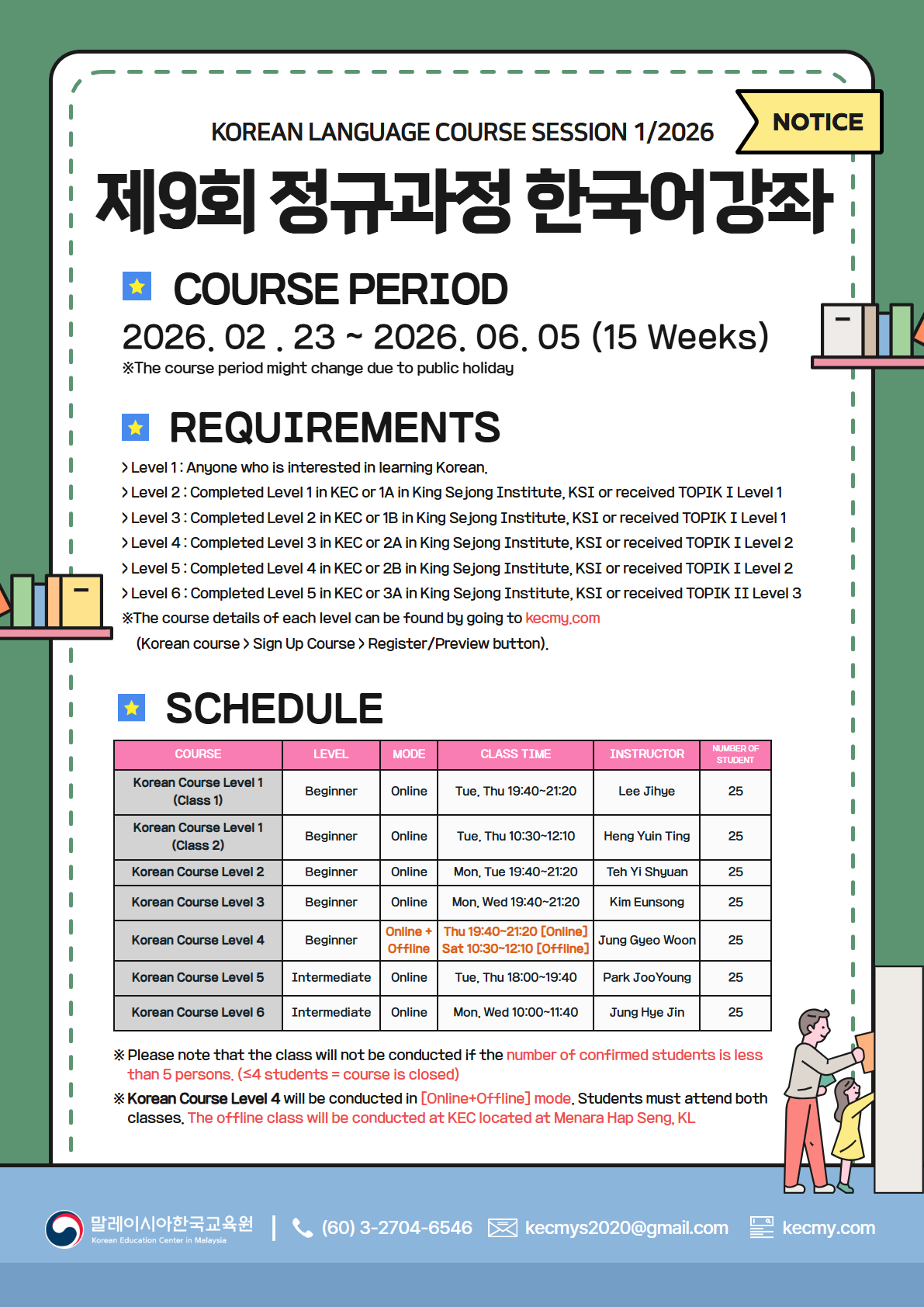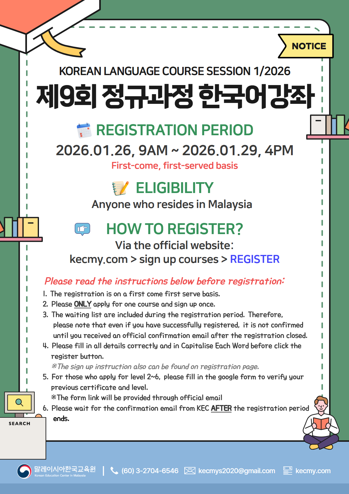 The Korean Education Center in Malaysia would like to inform you that the Regular Korean Language Course Session 1/2026 will open for registration soon.
